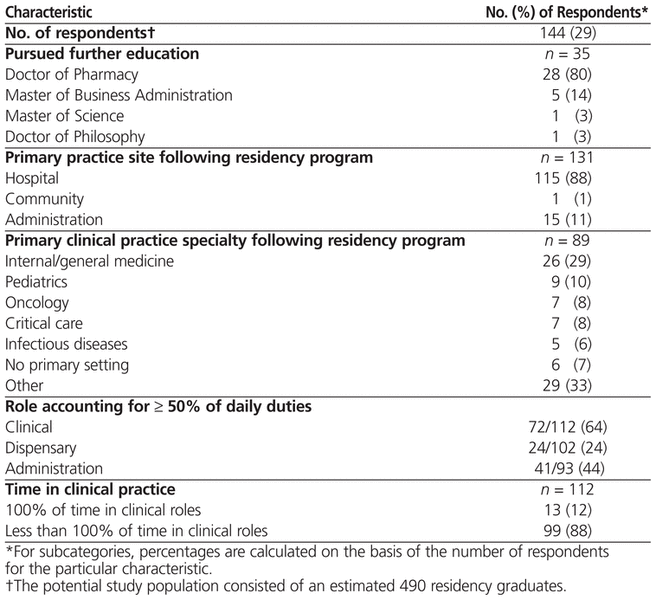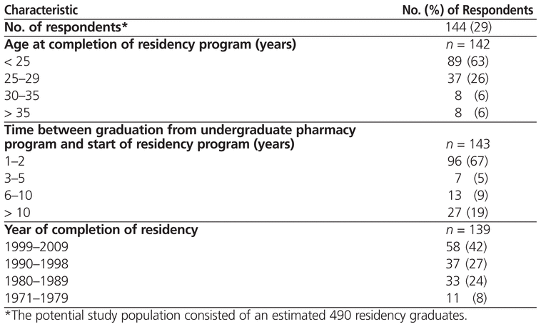 Most of the survey respondents had graduated in the 10 years preceding the survey and were less than 25 years old when they completed the residency program. The relative abundance of recent graduates can be attributed, in part, to an increase in the number of residency positions over the 10 years preceding the survey, specifically through new program starts in the Vancouver Island Health Authority and the Northern Health Authority. Almost all of the respondents had gone on to practise at a hospital site with clinical and/or administrative responsibilities. This finding highlights the importance of the role that residency programs continue to play in training pharmacists for practice in the hospital setting. A large percentage of respondents had primary responsibilities in clinical practice rather than administration. This may be a consequence of the relatively young age of the respondents: younger practitioners have yet to evolve and pursue higher leadership and managerial roles.