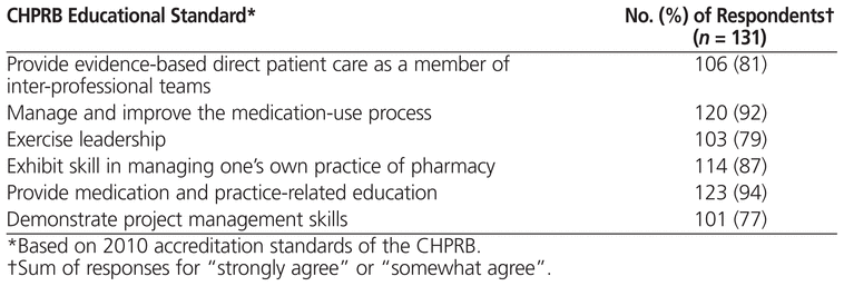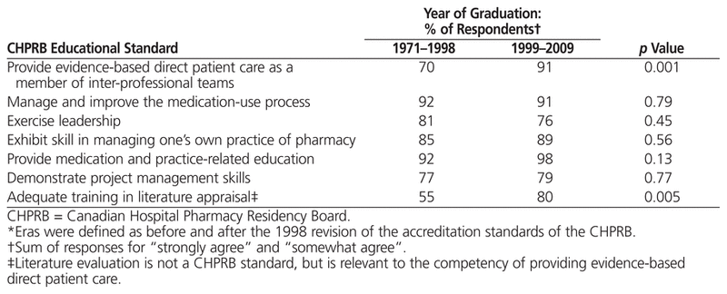 Of the estimated 490 graduates, 144 (29%) completed the survey. About 95% of respondents (125 of 131) agreed that the BCPPRPs had adequately prepared them for a career in hospital pharmacy practice. A majority strongly or somewhat agreed that their respective programs had allowed them to aquire all core competencies. There was less agreement about the achievement of project management and leadership skills. Analysis of these results by eras (specifically, before and after the 1998 revision of the CHPRB accreditation standards) showed statistically significant improvements in achievement for 2 of the educational outcomes, “providing evidence-based direct patient care as a member of an inter-professional team” ( p = 0.001) and “adequate training in literature appraisal” ( p = 0.005).