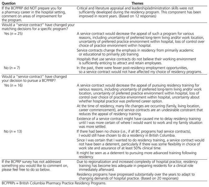 For the 4 questions for which qualitative data were elicited from respondents, the thematic analysis is presented in Table 5. The following 3 main themes were deduced from the responses: since the inception of the BCPPRPs, graduates’ skills in literature evaluation, teaching, and leadership and administration have improved; the BCPPRPs have evolved but sometimes fall short in terms of meeting the current demands of the profession; and service contracts remain controversial, and it is unclear how they will affect the applicant pool and matching process in the future.