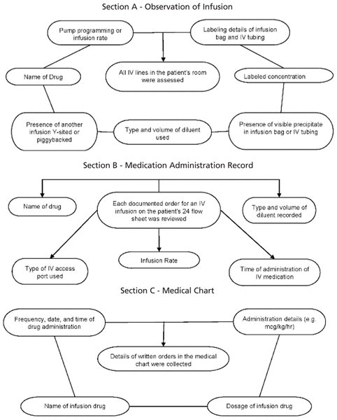 Four trained pharmacists (C.S.-S., L.B., V.F., T.B.) performed the data collection, using a standardized case report form to capture data during a 4-h time block within each observation shift. During the first 4 weeks of the study, one pharmacist supervised all data collection, to minimize interobserver variability. Each IV infusion bag was counted as a single dose, with data being collected from 3 separate sources: direct observation of the medication being administered to the patient (Section A, administration), the medication administration record (MAR) (Section B, documentation), and the patient’s medical chart (Section C, prescription) (Figure 1). Data were captured in a particular sequence, to minimize observer bias. Specifically, data for section A (administration) was assessed without prior knowledge of information for sections B (documentation) and C (prescription).