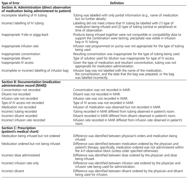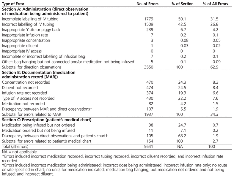 It was determined that up to 21 separate errors might occur in association with a single dose of an IV medication. In total, 1882 IV infusions were evaluated, and 5641 errors were identified. Omissions or discrepancies related to documentation accounted for 92.7% of all errors. The most common errors identified via each of the 3 data sources were incomplete labelling of IV tubing (1779 or 31.5% of all errors), omission of infusion diluent from the medication administration record (474 or 8.4% of all errors), and discrepancy between the medication order as recorded in the patient’s chart and the IV medication that was being infused (105 or 1.9% of all errors).