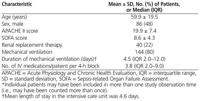 A total of 180 patients, with demographic characteristics as described in Table 2, were present in the medicosurgical ICU during the 4-h time blocks of the 40 observation shifts. A single patient could be included more than once if he or she was admitted to the ICU during consecutive data-collection shifts or was readmitted to the ICU. A total of 1882 IV infusions were administered during the 4-h time blocks of the 40 randomly selected shifts. The maximum number of errors that could have resulted from these 1882 infusions was 39 522.