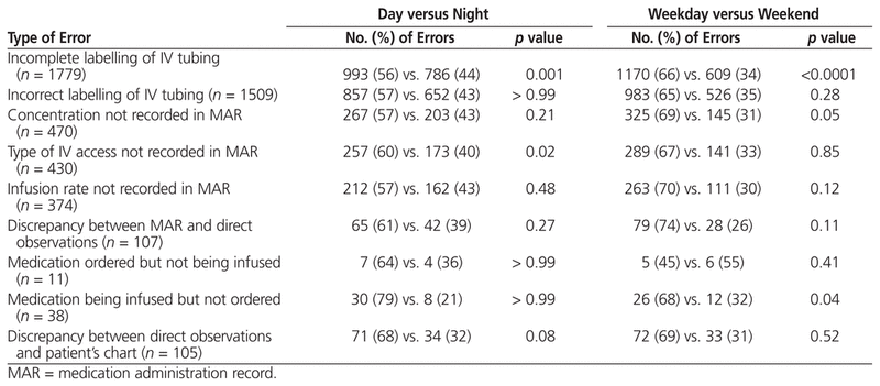 Errors were also categorized in relation to the time and day of the shift. More errors occurred during day shifts than night shifts (2759 versus 2064), and more errors occurred on weekdays than on weekends (3212 versus 1611 errors), but these differences were not statistically significant. Taking into account the 5:2 ratio of weekdays to weekends, the daily error frequency was 642 errors during weekdays (i.e., 3212 weekday errors/5 weekdays) and 806 errors during weekends (1611 weekend errors/2 weekend days), or a ratio of 44% to 56% (Table 4). Labelling discrepancies for the IV tubing were more commonly detected during day shifts than night shifts and during weekday shifts rather than weekend shifts (Table 4). As well, the concentration of medication in the IV infusion was less likely to be documented and observers were more likely to observe a medication being infused into the patient without an order in the patient’s chart during weekday shifts. The type of IV access was less likely to be documented in the MAR during day shifts than during night shifts.