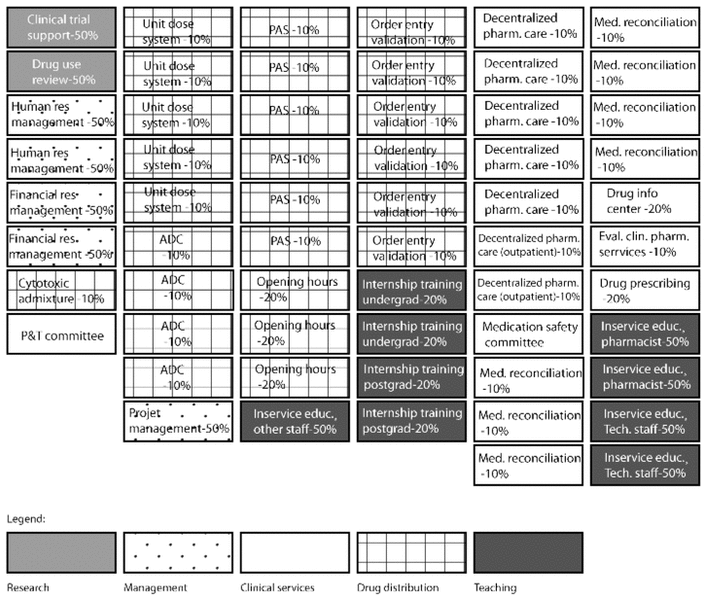 Figure 1 Example of a team’s prioritization of pharmaceutical activities and services. The colour-coding used in the simulation exercise for the 5 domains of pharmaceutical activities is represented here by graphic patterns. ADC = automated decentralized cabinet, PAS = parenteral admixture service. |