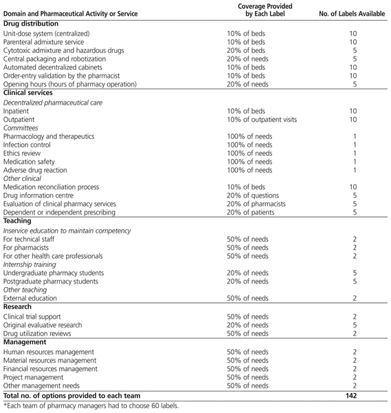 Each team was given the following written instructions. “You are acting as the pharmacy management team for a new 300-bed teaching hospital, which operates within a health care system that faces financial, human, and material constraints. For the purpose of this simulation, pharmaceutical practice has been divided into 5 domains: drug distribution, clinical services, teaching, research, and management. You have been given a set of 142 coloured labels, representing a total of 32 pharmaceutical activities and services (Table 1). Each label represents about the same amount of resources to be expended for that service or activity. The labels are colour-coded, according to the 5 domains of pharmacy practice: green for drug distribution, white for clinical services, red for teaching, blue for research, and brown for management. You have 30 minutes to select the pharmacy services that your department will provide. Please select, and paste on your group’s posterboard, the 60 labels representing priority activities for your hospital. The 60 labels will represent all the funding that you have for pharmaceutical activities and services. You may decide to only partially implement a service (e.g., a service for only 50% of beds) or to fully implement a service (i.e., 100% of beds).”