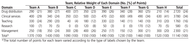 The relative weights for activities and services ranged from 5% for research to 34% for clinical services (Table 2). Interestingly, the teams prioritized more clinical activities (range 24% to 49% of total points) than drug distribution activities (range 14% to 37% of total points).