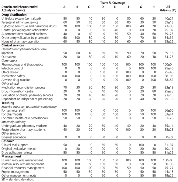 Averaged over all 8 teams, the relative weights attributed to each domain of pharmacy practice were 34% for clinical services, 24% for drug distribution services, 21% for management activities, 16% for teaching services, and 5% for research activities (Table 2). The extent of coverage for individual activities and services varied greatly from one team to another. For example, for 19 of the 32 activities, the range in coverage spanned more than 60 percentage points, and there were 9 activities for which coverage ranged from 0% to 100% (Table 3).