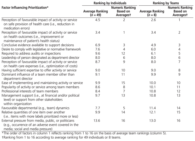 In the Hospital Pharmacy in Canada 2009/2010 Report , Bussières noted that the majority of clinical activities that were given a high priority score by survey respondents were ones for which there is little evidence to support their economic or clinical value.9 This pilot simulation study identified a number of factors that influenced individual and team prioritization. It is of interest that participants ranked “perception of favourable impact of the activity or service” higher than “conclusive evidence” to support the activity or service. Perhaps it is time for pharmacy managers to examine and validate their perceptions of the value of various activities and services, if they really want to claim that pharmacy is an evidence-based profession. The 3 most important factors in this prioritization exercise were similar for individual and team rankings: “perception of favourable impact of activity or service on safe provision of health care”, “perception of favourable impact of activity or service on health outcomes”, and “conclusive evidence available to support decisions”. However, some factors, such as “required to address audits or inspections”, were ranked low by individuals (rank 12) but were ranked higher by the teams (rank 5). Conversely, “favourable departmental dynamics” was ranked high by individuals (rank 5) but low by teams (rank 14).