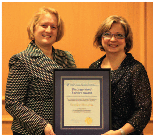 Carolyn Bornstein (right), recipient of the CSHP Distinguished Service Award, with Dr Judith Glennie (left), of Johnson & Johnson Family of Companies. |