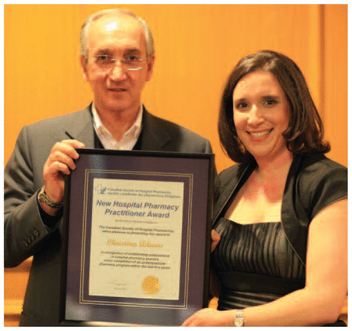 Christina Adams (right), recipient of the New Hospital Pharmacy Practitioner Award, with James Boudreau (left), of Sandoz Canada Inc. |