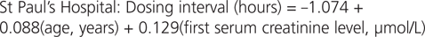 The nomogram developed from these data depicts dosing intervals in hours rounded to standard dosing times (Table 2). If the predicted interval fell between 2 standard dosing intervals, a range is presented. As illustrated in the nomogram, dosing interval increased with increasing age and increasing serum creatinine.