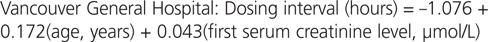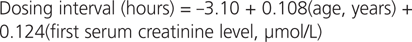Data from 78 patients at one hospital and 91 patients at the other were used in developing the respective institutional nomograms. For each hospital’s data set, both age and initial serum creatinine were significantly associated with the predicted dosing interval ( p < 0.001). Validation in a total of 105 test patients showed that the integrated nomogram had a predictive success rate of 56%.