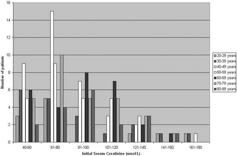 Figure 1. Number of patients in each serum creatinine and age category used for nomogram development. |