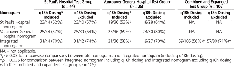 The proportions of unique patients in each test group for whom the St Paul’s Hospital nomogram, the Vancouver General Hospital nomogram, and the integrated nomogram predicted the appropriate dosing intervals were compared with a χ2 test (with a priori definition of p < 0.05 as significant). In addition, for each nomogram, predictive success including the q18h dosing interval was compared with predictive success excluding the q18h dosing interval using the χ2 test (with a priori definition of p < 0.05 as significant). No comparisons were made between the site and integrated nomograms excluding the q18h dosing interval.