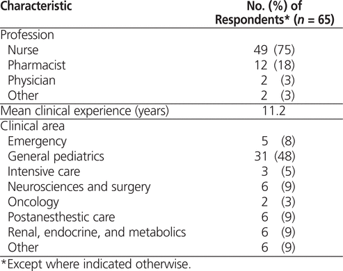 A total of 76 responses were received from pharmacists, nurses, and physicians at C&W, of which 11 were incomplete except for demographic data and were therefore excluded. The remaining 65 responses were included in the analysis. Nurses accounted for most of the C&W respondents, and most respondents were working in the area of general pediatrics (Table 1).