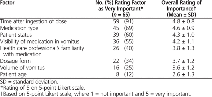 Respondents rated the importance of 8 factors affecting the clinical decision to redose oral medications after emesis on a 5-point Likert scale, and 4 of these factors were given a rating of 5 (indicating “very important”) by more than half of respondents: time after dose ingestion, medication type, patient status, and visibility of medication in vomitus (Table 2). For all 4 of these factors, the mean importance rating was greater than 4 (Table 2).