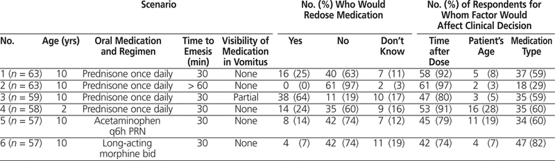 In designing the surveys used in this study, we were interested in the factors influencing health care professionals’ decisions on the course of action to be taken when a pediatric inpatient vomits a dose of oral medication. We asked about factors that were considered in the published recommendations that we identified,2–4 as well as factors that we thought might be specific to pediatric patients or to hospital inpatients. In the survey of current practice at C&W, the most important factors that health care professionals used to decide about redosing were time after ingestion, medication type, patient status, and visibility of medication in the vomitus. The caregiver’s familiarity with the medication, the dosage form, and the volume of vomitus were less important, and the patient’s age was minimally important. Interestingly, in the survey of health care professionals at other pediatric institutions and pediatric pharmacists, the guidelines, if present, did not consider patient status or caregiver’s familiarity with the medication. However, most of the guidelines considered time after dose ingestion, and about one-third considered medication type and visibility of medication in the vomitus.