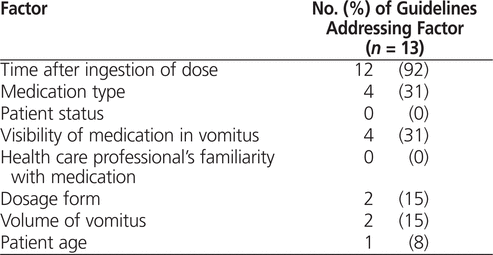 Sixteen (30%) of the respondents indicated that their pediatric hospital or ward had a guideline, protocol, and/or recommendation regarding what to do in the event of vomiting after ingestion of oral medications. The majority of these guidelines were ward- or service-specific (9 [56%]); 3 (19%) were hospital-wide, and 2 (12%) were drug-specific. Thirteen of the respondents provided further details about their respective guidelines (Table 4). Most stated that their guidelines accounted for the time after dose ingestion; other factors were variably considered. None of the guidelines took into account the patient’s status or the health care provider’s familiarity with the medication. Of the guidelines used in respondents’ institutions, only 3 had supporting references: 1 guideline was based on an oncology-specific recommendation for practice,5 and 2 guidelines were based on the article in Canadian Pharmacist’s Letter .2 Only 2 respondents submitted their institutions’ guidelines along with the survey response; in both cases, the guideline consisted of the article in the Canadian Pharmacist’s Letter. 2