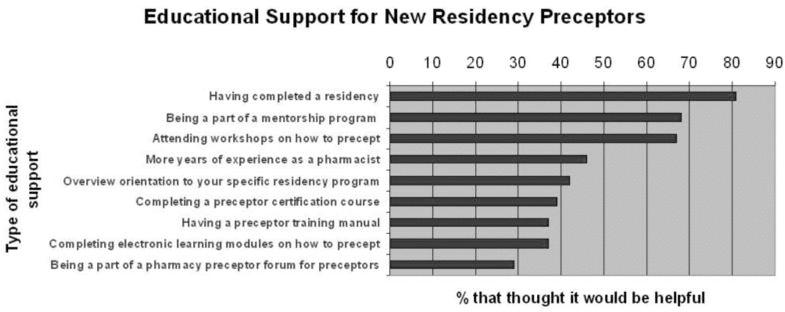 The goal of this study was to conduct a needs assessment focused on educational support for pharmacy residency preceptors. To the authors’ knowledge, this was the first survey of preceptors from general hospital pharmacy residency programs across Canada for this purpose.