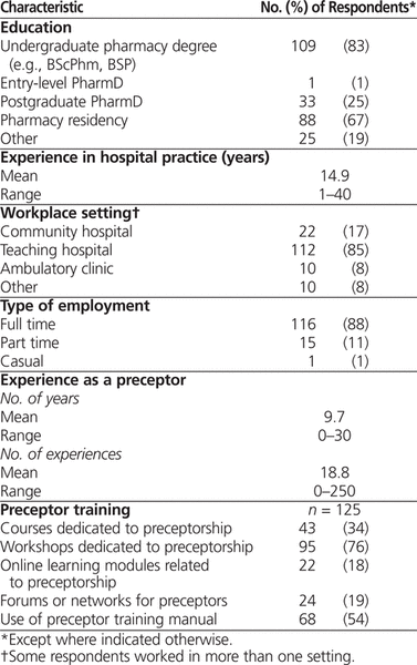 Characteristics of 132 Respondents* to an Online Survey Assessing Needs of Pharmacy Residency Preceptors