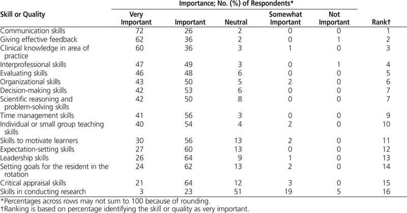 Preceptors rated almost all of the skills and qualities offered in the survey as important or very important for effective preceptors (Table 2). The top 3 skills and qualities ranked as “very important” were communication skills, giving effective feedback, and clinical knowledge in the area of practice. Skill in conducting research was deemed the least desirable, with only 3% of respondents rating it as “very important”. When ratings of “very important” and “important” were grouped, the top 3 results were the same.