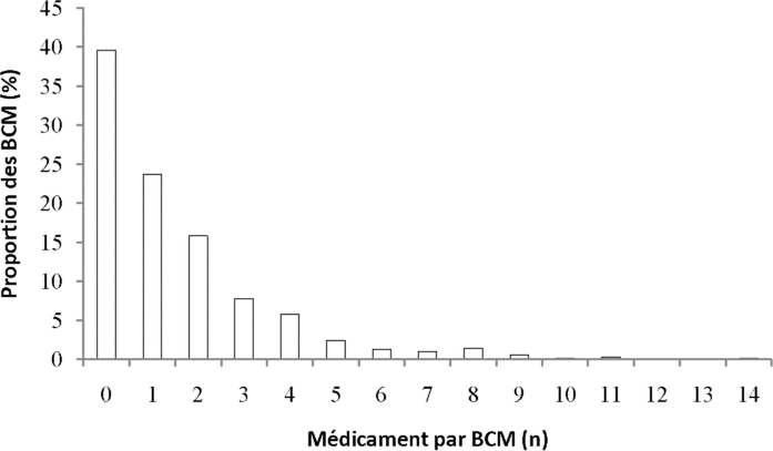La figure 1 illustre la proportion du nombre de médicaments par BCM à l’admission. La majorité des patients n’avaient à leur BCM aucun médicament (40%) ou avaient un médicament (24%) par BCM.