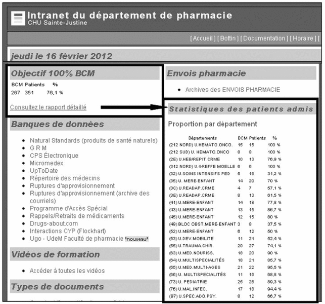 En avril 2008, 46% des dossiers de patients admis comportaient un BCM à l’admission, contre 53% en novembre 2008, soit un mois avant la visite d’agrément en décembre 2008. De décembre 2010 à février 2011, le personnel soignant a transmis le BCM à l’admission dans une proportion de 28%. Lors du suivi de l’étude pilote, nous avons développé un volet de l’intranet pharmacie permettant de publier en temps réel le taux de BCM remplis et télécopiés au département de pharmacie. L’affichage met en évidence les chambres-lits (dénominalisées) ne comportant pas de télécopie du BCM à l’admission, en vue de faciliter le travail de l’assistante, qui pouvait alors cibler les BCM à remplir et à télécopier. À partir de septembre 2011, tout le personnel soignant, et particulièrement les cadres et les assistantes-infirmières de chaque quart de travail, a été sensibilisé à la possibilité de consulter cette donnée. Dans la perspective d’une visite d’agrément annoncée pour décembre 2011, et dans le respect de la pratique organisationnelle requise, le taux moyen de patients détenant un BCM à l’admission est passé à plus de 80% à partir de novembre 2011, et ce taux s’est maintenu jusqu’à maintenant. La figure 2 illustre un exemple d’affichage web du taux de BCM remplis et télécopiés ainsi que le détail par unité de soins. La rétroaction en temps réel a été un facteur clé de succès dans ce projet et est implantée de façon permanente dans notre intranet.