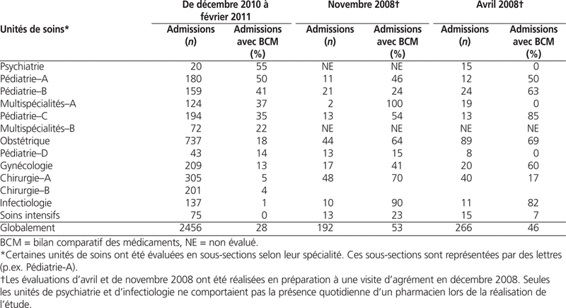 Les admissions des mères et des enfants ayant séjourné dans notre institution du 6 décembre 2010 au 6 février 2011 ont été incluses dans l’étude. Les admissions en oncologie ont été exclues, puisque la plupart des médicaments utilisés pour les patients ambulatoires étaient dispensés par la pharmacie satellite externe à notre établissement plutôt que par la pharmacie communautaire et que l’équipe de pharmaciens en oncologie élaborait le BCM à l’admission à partir du dossier informatisé complet.