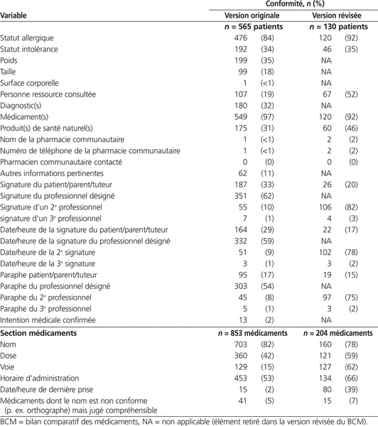 Les améliorations apportées à la version révisée du formulaire de BCM ont contribué à une augmentation de la conformité des éléments suivants : statut allergique (84%, version originale c. 92%, version révisée), personne ressource consultée (19% c. 52%), mention de produits de santé naturels (31% c. 46%), dose de médicament (42% c. 59%), voie (15% c. 62%), horaire d’administration (53% c. 66%), date/heure de la dernière prise (2% c. 39%) (tableau 2).