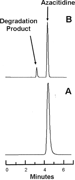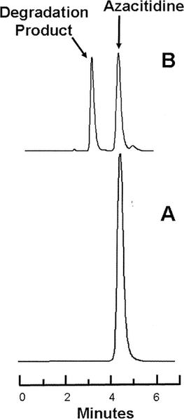 Figure 2. Representative chromatograms obtained during the stability study at 4°C. Lower panel (A): Azacitidine 10 mg/mL in water at time 0. Upper panel (B): The same sample of azacitidine 10 mg/mL after 3 days’ storage in a glass vial at 4°C, at which time 75% of the initial concentration remained. The major degradation product observed in the accelerated degradation study was observed in all samples stored at 4°C. |