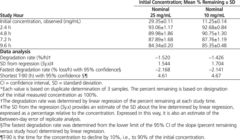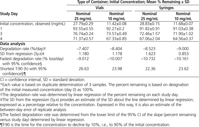 The data were also analyzed by linear regression, and T-90 was calculated for each concentration–container combination. When the 95% confidence limits for the degradation rates were used to estimate T-90, a beyond-use date of 22 h or longer was calculated for solutions reconstituted with cold (4°C) sterile water for injection (Table 2).