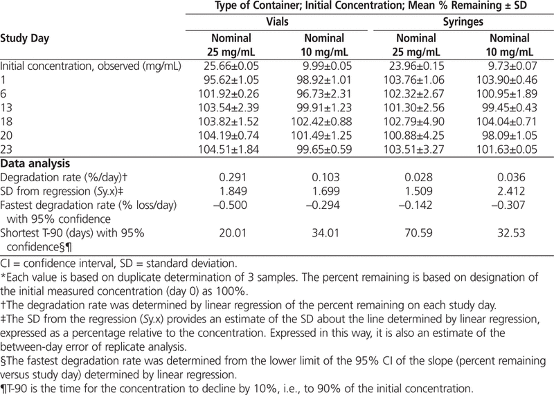 After the coefficient of variation of replicate determinations of concentration for an assay was determined, a power calculation indicated that 2 replicates would be required to ensure that the analytical method could distinguish between concentrations that differed by at least 10%.11,12 Means were calculated for replicate analyses and are reported in the summary tables. Mean results from different days for each test were compared statistically (by linear regression) to determine if there was an association between the observed result and time. Analysis of variance was used to test differences in degradation rate between various container–concentration combinations. The 5% level was used as the a priori cut-off for significance. The concentration of a solution on a particular day was considered “acceptable” or “within acceptable limits” if it was greater than 90% of the initial concentration (as determined on day 0) and if the amount found on that day, with 95% confidence, exceeded 90% of the initial concentration.