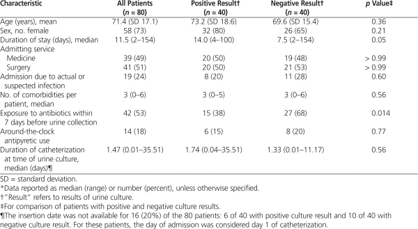 A single investigator (J.C.) conducted a comprehensive review of each patient’s health record to collect demographic and clinical characteristics, including duration of catheterization, prior and concurrent antibiotic and antipyretic use, past medical history, presenting signs and symptoms, diagnostic tests performed and their results, antibiotics prescribed, and duration of treatment. The Ontario Drug Benefit profile was reviewed, when available, to obtain further information on outpatient exposure to antibiotics. Data were manually transcribed onto a standardized form.