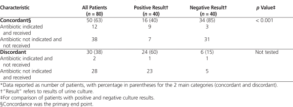 A total of 591 charts were screened to generate the targeted number of patients. Baseline demographic characteristics were comparable for the 2 groups, except antibiotic exposure before urine collection was significantly more frequent for the group with negative culture results. The treatment decision was concordant in 40% (16/40) of the patients with a positive culture result and 85% (34/40) of those with a negative culture result ( p < 0.001). The most common reason for discordance was administration of antibiotics when not indicated (23 of 24 patients with a positive result and 5 of 6 patients with a negative result), which accounted for 165 and 32 unnecessary days of therapy per 1000 inpatient-days, respectively ( p < 0.001). Adverse effects occurred in 2 of the 23 patients with a positive result who received antibiotics that were not indicated.