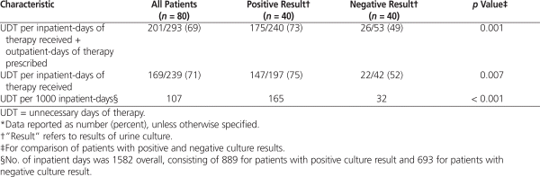 Although the unnecessary use of antimicrobials related to catheter urine cultures has been previously described, it has not been well quantified.9,10 The current analysis determined that approximately 70% of antibiotic days related to catheter urine cultures were unnecessary and that patients with a positive culture result accounted for 87% of those unnecessary days of therapy. The number of unnecessary days of therapy remained significantly greater for patients with a positive result than for those with a negative result after standardization to 1000 inpatient-days, which supports the need for an antimicrobial stewardship initiative.