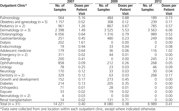 The objective of this cross-sectional observational study was to compare the number of drug samples available in outpatient clinics in a mother–child university hospital centre in the province of Quebec in 2007, 2009, and 2012. In the study hospital, drug samples were not allowed in patient wards but were tolerated in outpatient clinics. Drug samples were monitored every 6 months by pharmacy staff, who made unannounced visits to the clinics. In addition to biannual monitoring, extensive audits were conducted periodically over 1- to 2-week periods. During the first extensive audit, in 2007, the number of units (e.g. tablets, vials) of drug samples in all outpatient clinics was counted. The audit was repeated in November 2009 and July 2012. For each audit period, the total numbers of both units and doses of drug samples were calculated, and the average number of doses was estimated for liquids (0.5 mL/dose) and topical agents (0.5 g/dose). The number of doses of drug samples per patient visit was also calculated, to indicate potential exposure of patients to samples.
