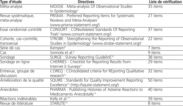Le site Internet (www.equator-network.org/) est mis à jour périodiquement et comporte au moins 265 grilles, articles pivots et lignes directrices. Connaissez-vous les lignes directrices, telles que MOOSE,4 CONSORT5 et STROBE6? Les listes de vérification sont classées selon le type d’étude, les tests statistiques réalisés, les domaines de recherche ou procédures réalisées, ainsi que selon les sections types utilisées dans les articles scientifiques (p. ex. figures, discussion et conflits d’intérêts).