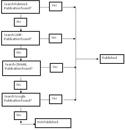 To determine the publication status of residents’ projects, a standard search strategy was adapted (as shown in Figure 1).6,7 Several databases were searched in the following sequence: PubMed (1999 to February 28, 2011), all online issues of the Canadian Journal of Hospital Pharmacy ( CJHP ) (2000 to February 28, 2011), Cumulative Index of Nursing and Allied Health Literature (CINAHL) (1999 to February 28, 2011), and Google (no time frame specified). The searches were performed between February 28, 2011, and April 25, 2011.