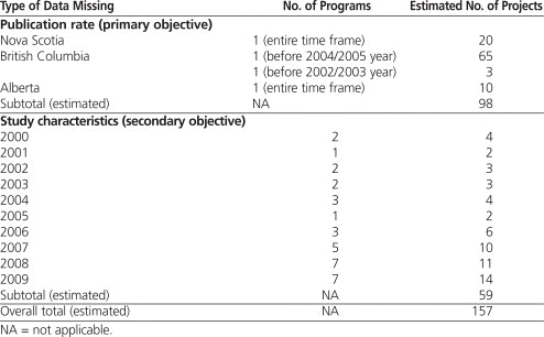 In Ontario, it was expected that the university’s library would contain reports for all residency projects completed during the study period; however, this was not the case, probably because of delays in processing the large number of reports (there being over 30 residency positions in this province each year). Most of the missing projects were from a few institutions, with the majority of data missing from 2007 to 2009 (35 [59%] of 59 missing projects). These 35 projects accounted for 40% of the 88 projects completed in that period. The missing data may have significantly affected results for the final 3 years of the study period.