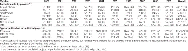 The most important limitation in this study was missing data for several centres and years. Multiple avenues were used in attempts to collect complete information, and data for approximately 80% of known residency projects were obtained. The amount of missing data was estimated from the approximate number of residents usually registered in each program (at the time of this analysis) and the number of years for which data were unavailable. Given that programs are likely to expand over time and gain more residents, the estimated amount of missing data may be inflated. However, unless the publication rate is grossly different in centres with missing data than in programs elsewhere in the country, the overall publication rate should not be significantly affected. The province that accounted for the majority of missing data (British Columbia; 68 [69.4%] of 98 missing projects) had an overall publication rate of 34% (see Table 2), similar to the national publication rate (32.2%). As mentioned in the Methods section, there was a change in the oversight of this province’s residency programs in 2007. Before amalgamation, the individual programs had been running for 40 years, and although project records may exist somewhere, they could not be retrieved. Interestingly, there appears to have been an increase in the number of published projects from this province since 2006 (see Table 2), possibly coinciding with the creation of a central residency coordinator position with program consolidation. However, given that much of the information for years preceding 2005 could not be obtained, the publication rate for those earlier years, and hence the appearance of an increase, may be inaccurate.