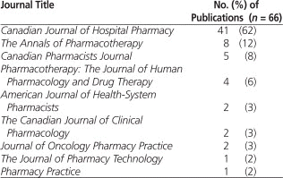 The 107 full-text manuscripts identified in the current study were published in a total of 45 different journals. Most of these projects (66 [62%]) appeared in pharmacy-specific journals, most commonly the CJHP (41 [62% of pharmacy-specific journals]) (see Table 3). The remaining 41 projects were published in a total of 36 non-pharmacy-specific journals, most commonly The Canadian Journal of Infectious Diseases and Medical Microbiology , which accounted for 3 articles (7% of publications in non-pharmacy-specific journals). Appendix 3 describes the sources in which published projects were located.