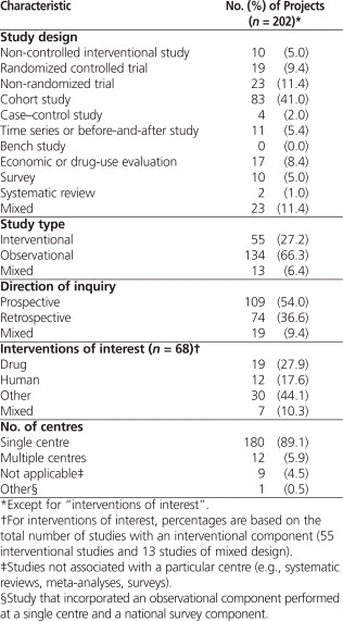 For projects fulfilling the inclusion criteria for the secondary objective, the following data were extracted: number of coauthors or co-investigators, disciplines of the coauthors or co-investigators, number of centres involved, time frame examined in the study, trial type, study design, intervention type (for interventional studies), and study topic. Appendix 2 contains definitions and explanations of the data extracted.