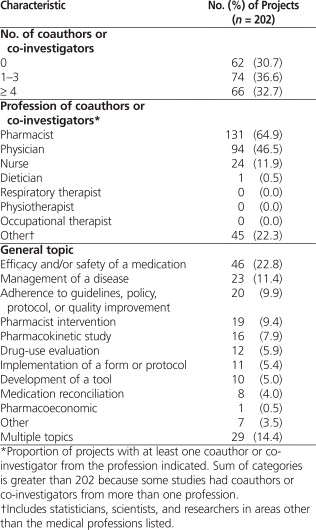 Study characteristics for the residency projects are summarized in Tables 4 and 5. Most of the projects involved a single centre (180 [89.1%]) and most were prospective (109 [54.0%]) and observational (134 [66.3%]). The projects were about evenly divided among those with no coauthors or co-investigators (62 [30.7%]), those with 1 to 3 collaborators (74 [36.6%]), and those with 4 or more collaborators (66 [32.7%]). Collaboration with other health professionals was common, most often physicians and nurses.