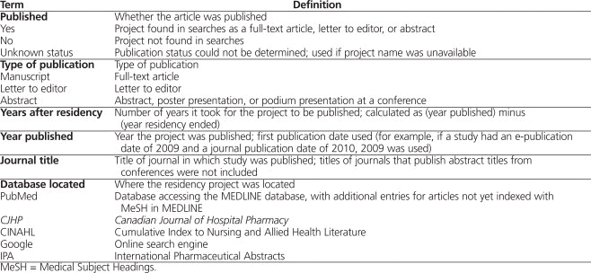 For all residency projects identified, the publication status was recorded, and for all published projects, the type of publication, year published, journal name (if applicable), and database in which the publication was found were recorded. Appendix 1 contains definitions and explanations of the data extracted.