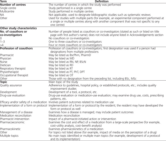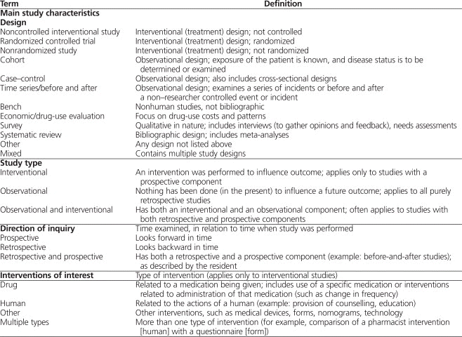 The proportion of prospective studies in the current study was similar to that in a previous study of pharmacy residency projects in the United States9 (54% versus 47%, respectively). The breakdown by study type was also similar to the previous US study9: most projects were observational, about one-third were interventional, and most studies occurred in a single centre. This similarity in choice of methods likely reflects the constraints of time, regulatory and ethical approval, and funding required for prospective studies, in particular randomized controlled trials; these constraints make such studies impractical for pharmacy practice residencies.