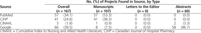 Lists of residents and project titles for the period of interest were obtained from residency coordinators. PubMed, CINAHL, the Canadian Journal of Hospital Pharmacy , and Google were searched for evidence of publication of each project identified, as an abstract or presentation at a meeting, a letter to the editor, or a full-text manuscript. The library holdings of the University of Toronto were reviewed to determine study characteristics of the Ontario residency projects.