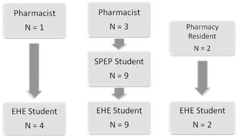In all cases, the mentor or preceptor was responsible for organizing the entire hospital experience. A student assigned to a pharmacy resident or pharmacist spent 100% of the rotation with the mentor. A student assigned to an SPEP student spent virtually all of the rotation with the mentor, but also spent some time in group discussions with the attending pharmacist. In this case, the EHE student was the full responsibility of the SPEP student, who coordinated all dates, times, and activities. Hence, the traditional 1:1 pharmacist to student ratio shifted to a 1:1 “SPEP or resident mentor” to “EHE student” ratio, with some group learning time for EHE students. Figure 1 shows a schematic of the participants involved and the various relationships among mentees, mentors, and pharmacists.