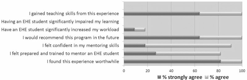 SPEP students and residents were asked to assess the quality of the experience and their own workload using a 5-point Likert scale. Overall, 9 (82%) of the 11 mentors strongly agreed and 2 (18%) agreed that they found the experience worthwhile (Figure 2). In addition, 7 (64%) strongly agreed and 4 (36%) agreed that they would recommend this experience to future SPEP students and residents. In assessing their workload while working with a mentee, most of the SPEP and resident mentors disagreed (5 [45%]) or strongly disagreed (1 [9%]) that workload had increased significantly; 3 of the mentors (27%) gave a neutral response, only 1 (9%) agreed and 1 (9%) strongly agreed that workload had increased significantly. In addition, respondents did not feel that working with EHE students impaired their own learning: 5 (45%) strongly disagreed and 6 (55%) disagreed that mentoring a student had significantly impaired their learning.