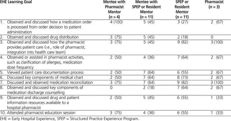 Mentees, mentors, and pharmacists were asked to assess whether the learning goals specified by the faculty’s EHE program had been attained. For some goals, the assessments of achievement varied widely by respondent group (Table 1).