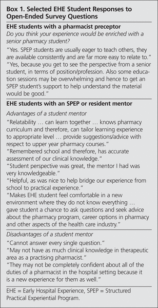 Through a series of open-ended questions, EHE students who had been paired with a pharmacist preceptor were asked whether they would have preferred an SPEP or resident mentor instead. Respondents described wanting an SPEP student as a mentor because SPEP students could provide a senior student perspective, would be easier to relate to, and would have greater availability. Respondents found the EHE rotation overwhelming at times and felt that an SPEP student could have provided support and acted as a bridge between second-year knowledge and hospital pharmacy practice. Respondents felt that a resident could have given insight into residency programs and that residents were more knowledgeable, in general, than SPEP students (Box 1).